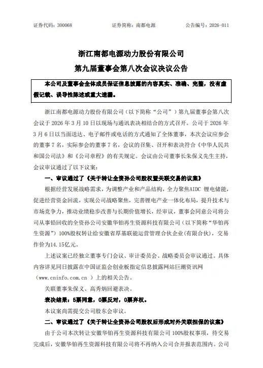 3月12日,南都电源(300068)发布关于转让全资孙公司股权暨关联交易的公告。